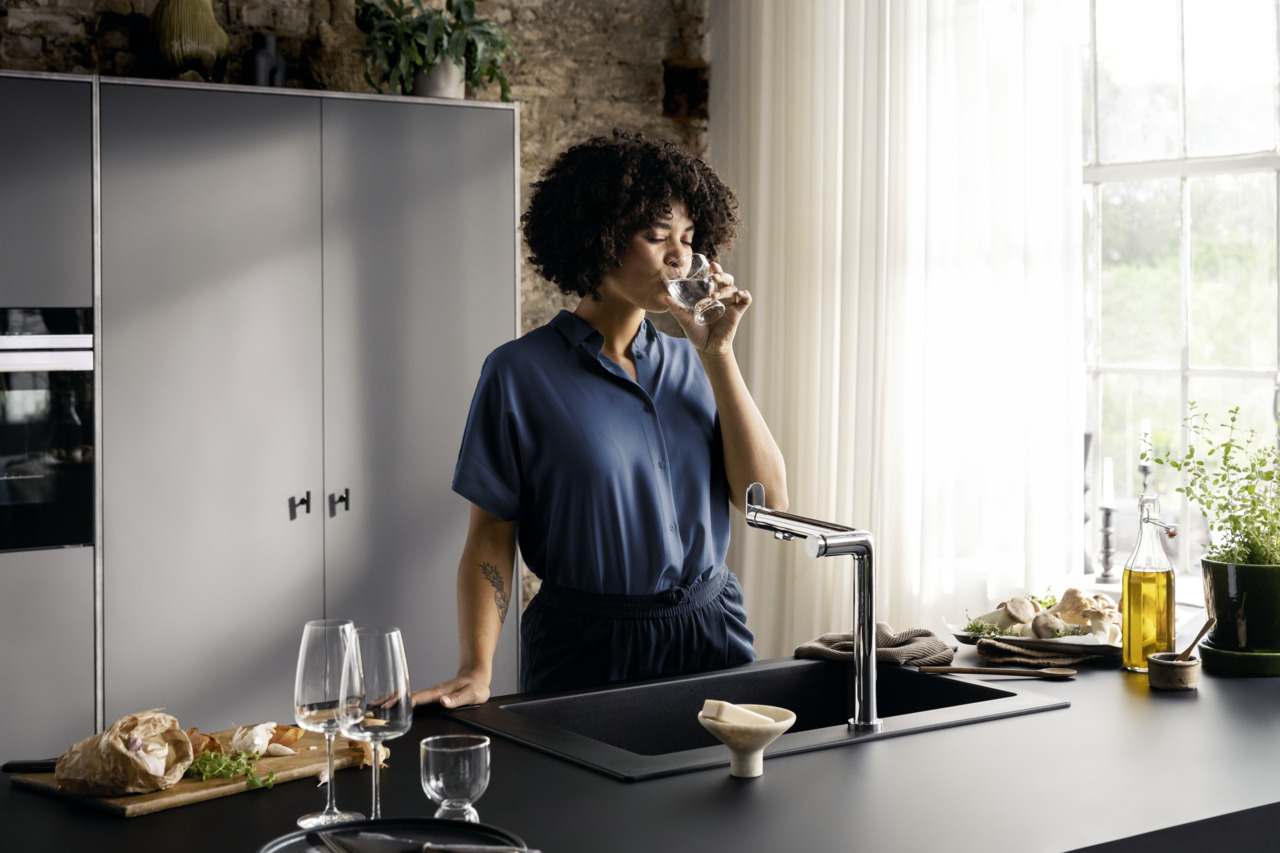 ist mit der SodaBase ausgestattet und bietet neben der Filter- und Mineralisierungseinheit gekühltes und mit Kohlesäure angereichertes Tafelwasser. Zudem lässt sich das System über die hansgrohe home App steuern.